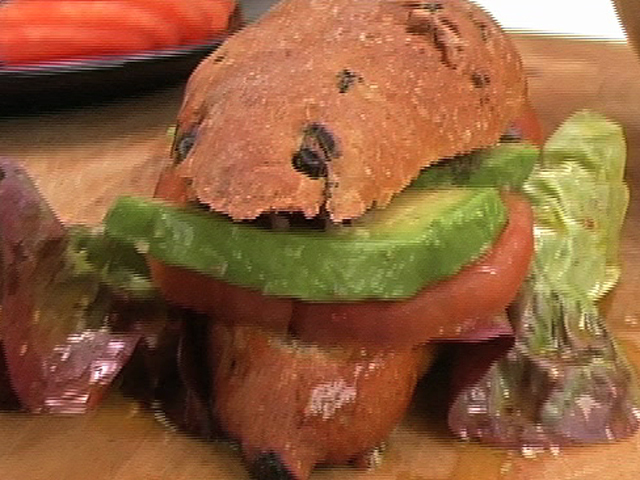 Вкусный салат в булочке с изюмом станет укрошением любого стола.Состав:булочки с изюмом — 3 штуки;авокадо — 1 штука;неколько листьев салата;лук — 1 штука;помидор — 1 штука;вишневый уксус, оливковое масло, перец, соль, зернистая горчица — по вкусу.